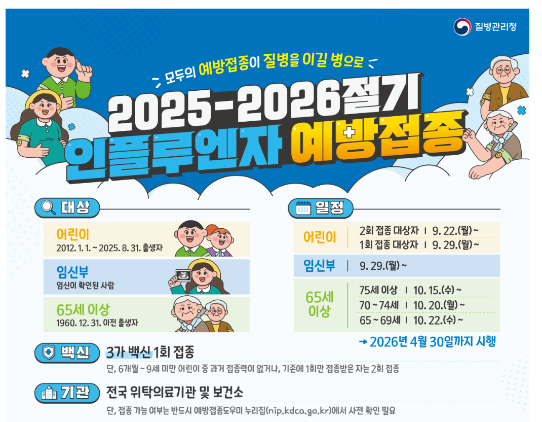 겨울철 독감 유행을 대비해 2025–2026절기 독감예방접종이 곧 시작됩니다. 특히 무료접종 대상이 되는 어린이, 임산부, 65세 이상 어르신은 정해진 시기 안에 접종을 완료해야 인플루엔자에 효과적으로 대비할 수 있습니다.