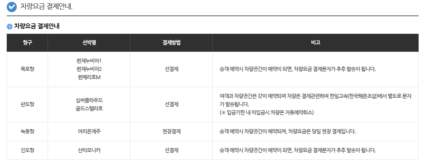 목포 제주 차량선적 결제 방식
