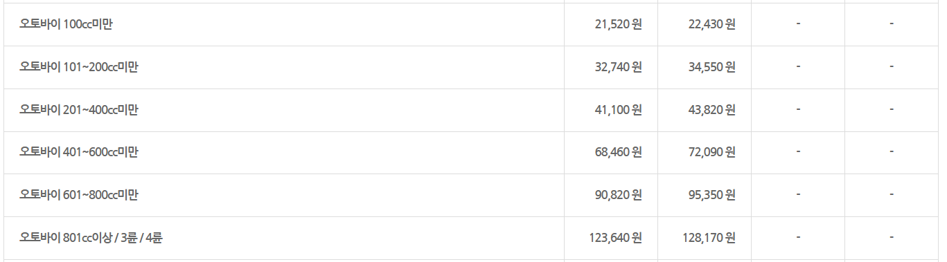 - 오토바이 100cc: 약 2만원대
