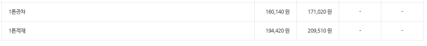 - 1톤 트럭: 약 16만원 ~ 20만원