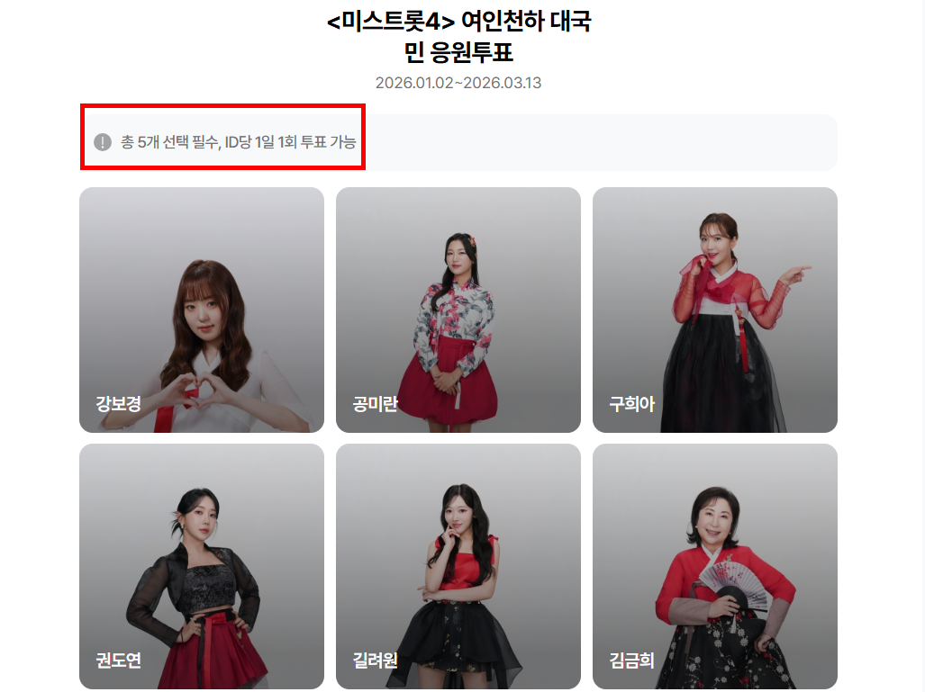 투표 페이지에서는 아래처럼 미스트롯4 참가자 사진과 이름이 표시됩니다.