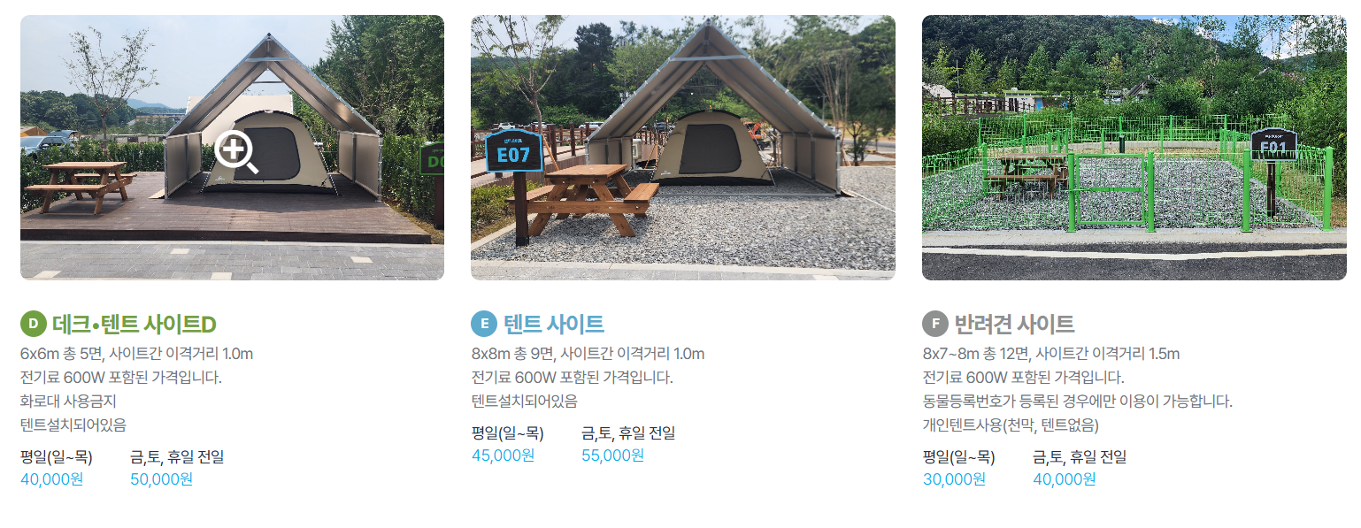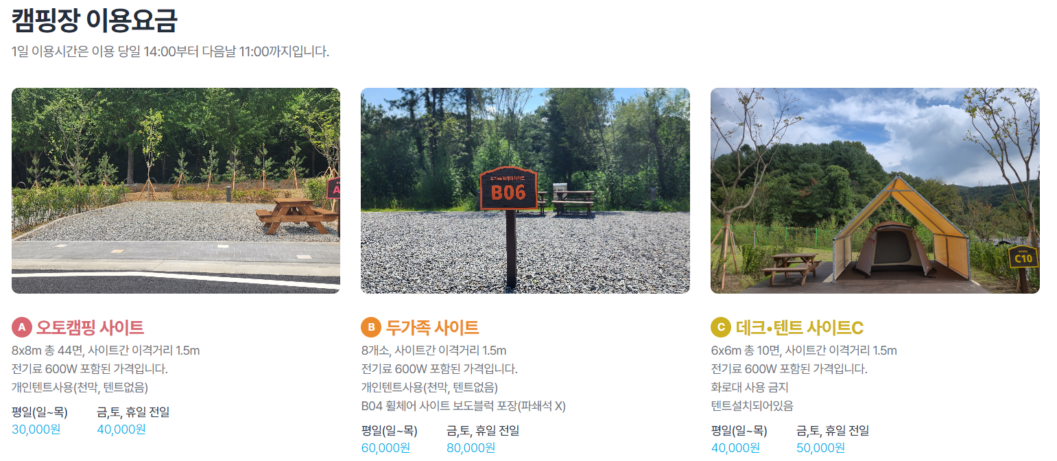 | 일반 텐트 | 45,000원 | 55,000원 | 주차 가능 구역 포함 |
