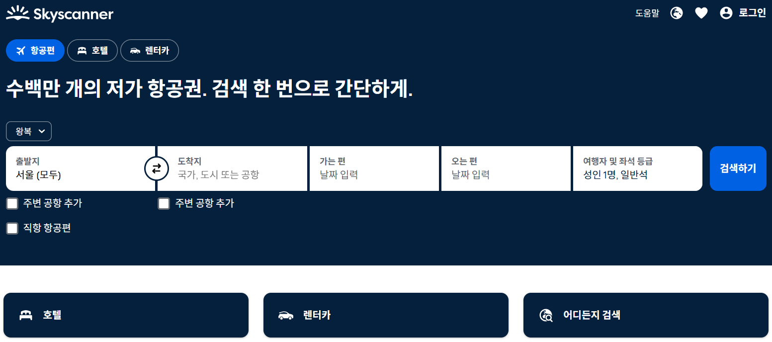스카이스캐너는 전 세계 수천 개 항공사의 가격을 한 번에 비교할 수 있는 대표적인 항공권 검색 엔진입니다.