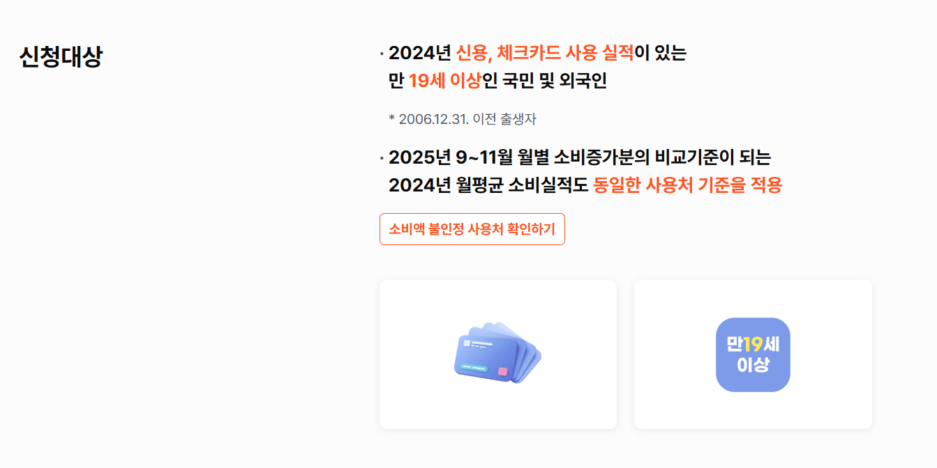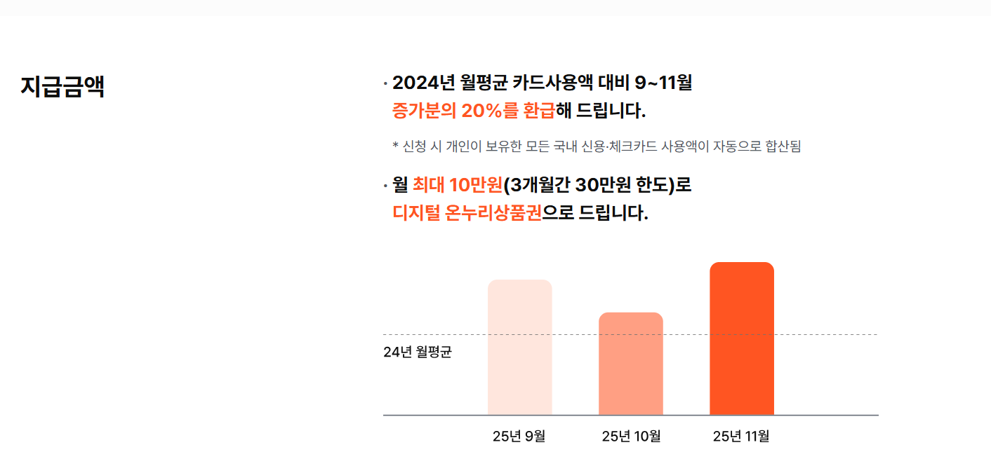 - 2024년 2~6월 월평균 카드 사용액보다 2025년 9~11월에 더 많이 쓴 금액의 20% 환급