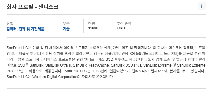 샌디스크는 웨스턴디지털(Western Digital)의 자회사로, SSD·플래시 메모리·데이터 저장 장치 분야의 대표 기업입니다.