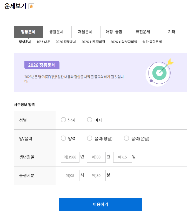 - 생년월일, 성별 입력 후 운세 선택