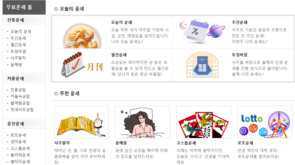 - 꿈해몽, 로또운, 궁합운세 등