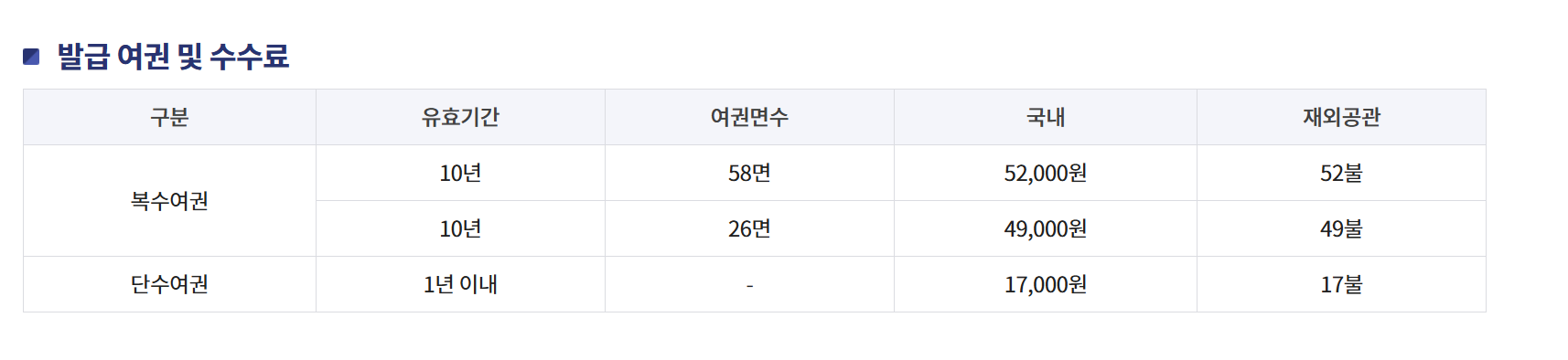 여권 종류에 따라 수수료가 다르게 적용됩니다.