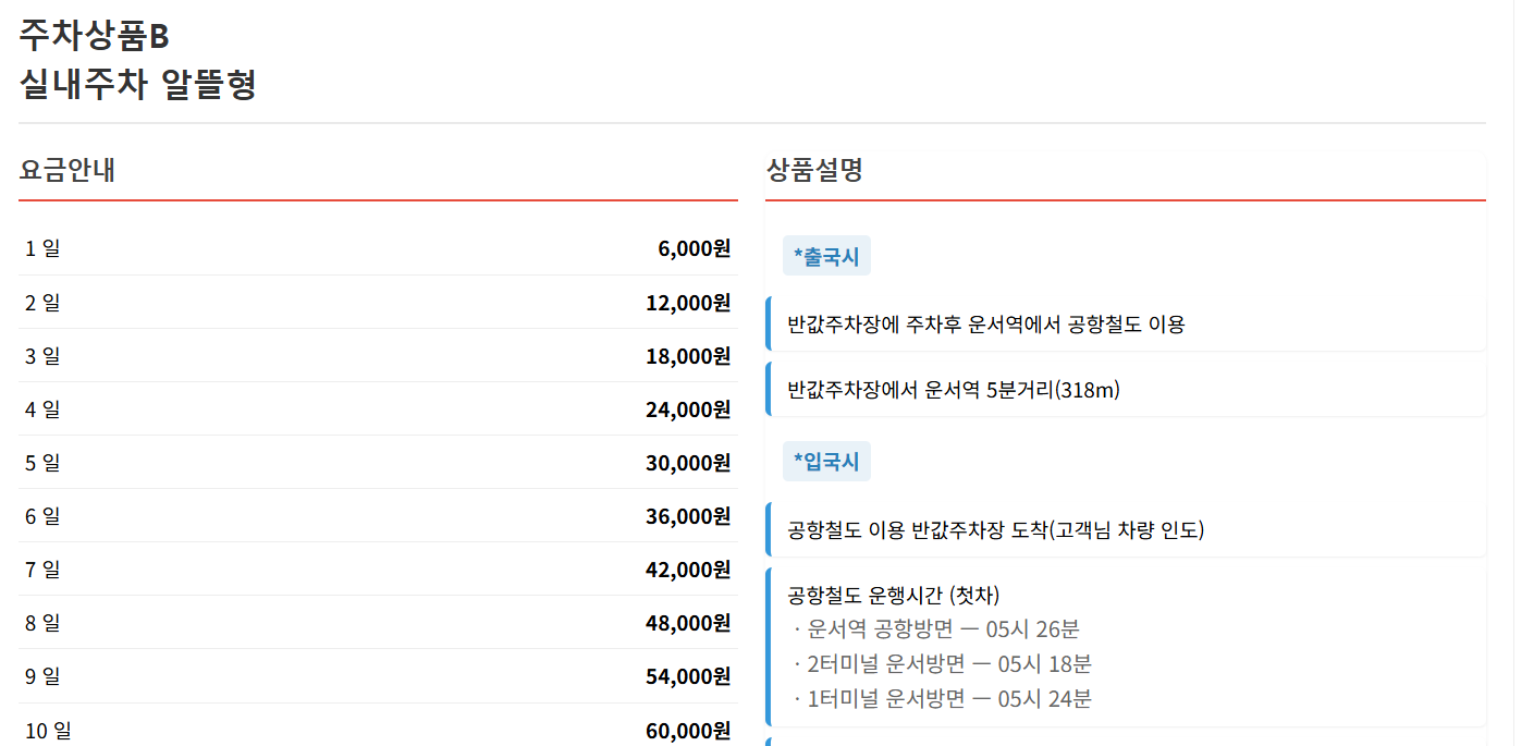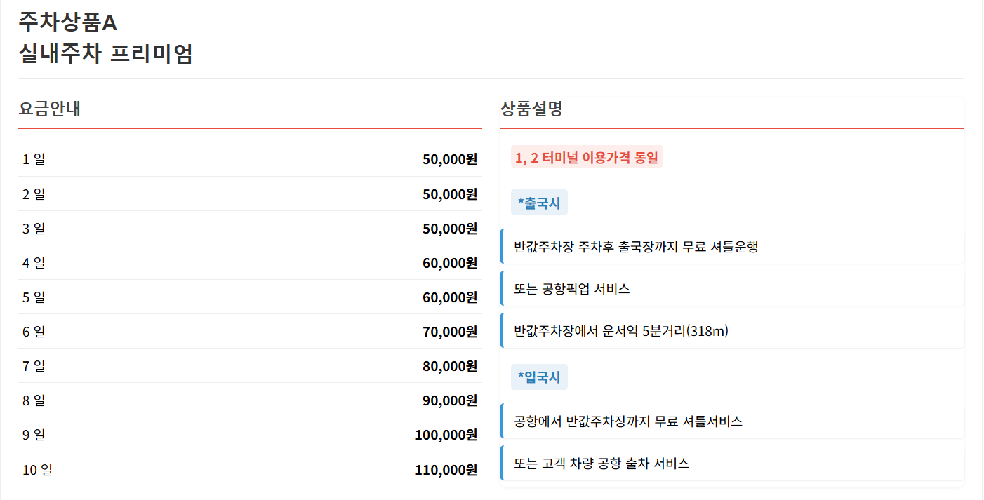 | 주차대행 (발레파킹) | 차만 맡기고 공항 이동 | 공식업체 이용 권장 | 단기주차장 지하 A구역 |