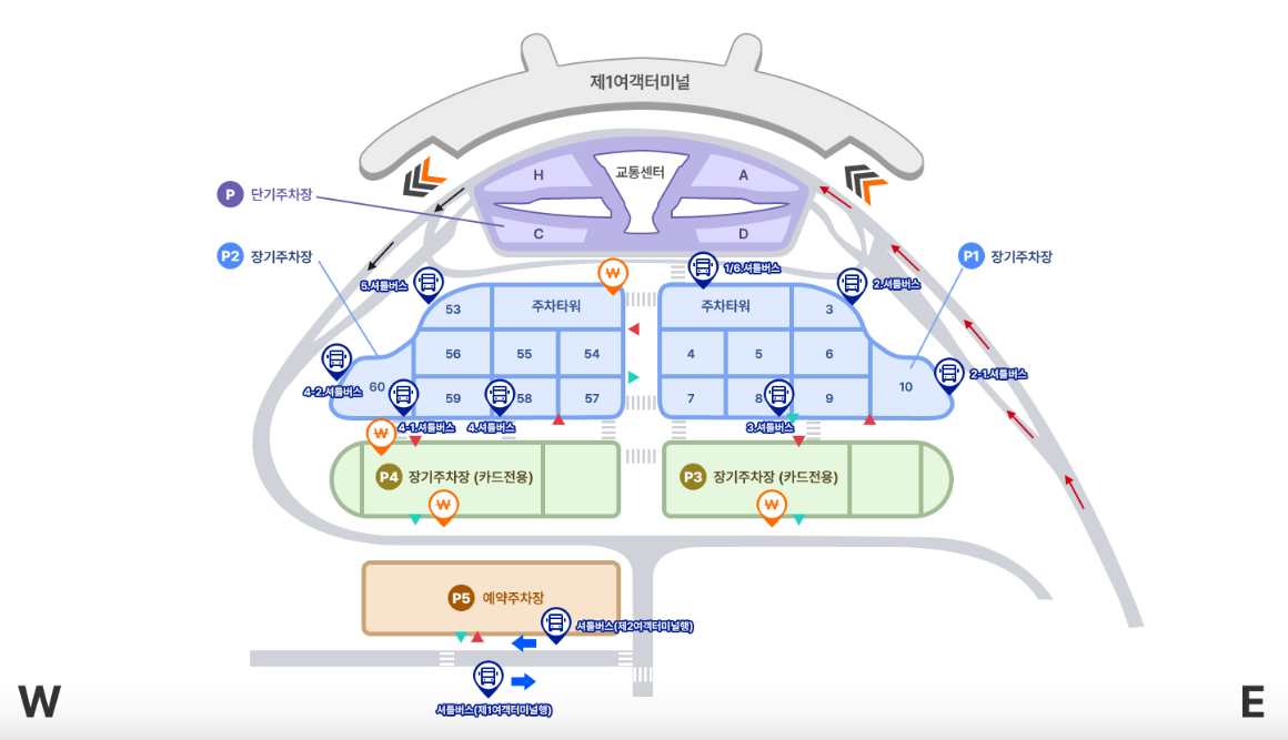 | 단기주차장 | 터미널과 가장 가까움, 짧은 시간 이용자 용 | 승용차 전용, 높이 2.1m 이하 | A, C, D, H 구역 |