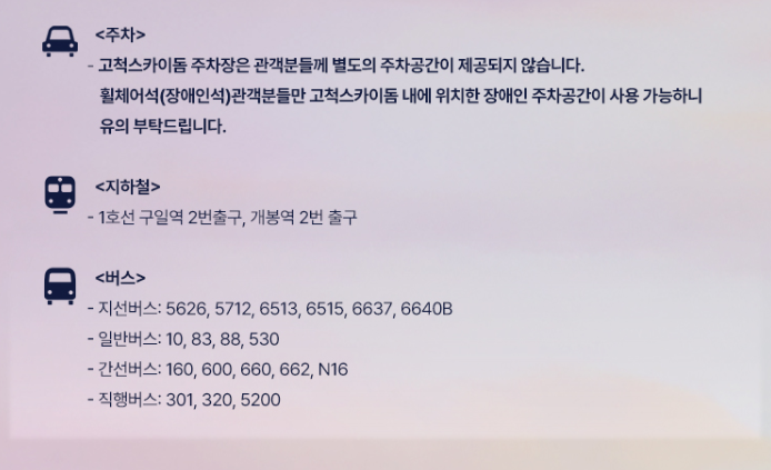 📌 특히 고척스카이돔은 출입구가 많아 입장 동선이 분산되므로 미리 도착하면 편리합니다.