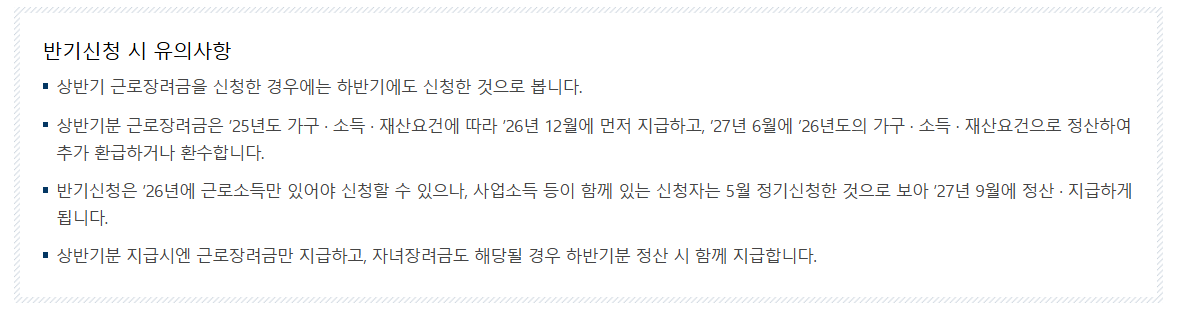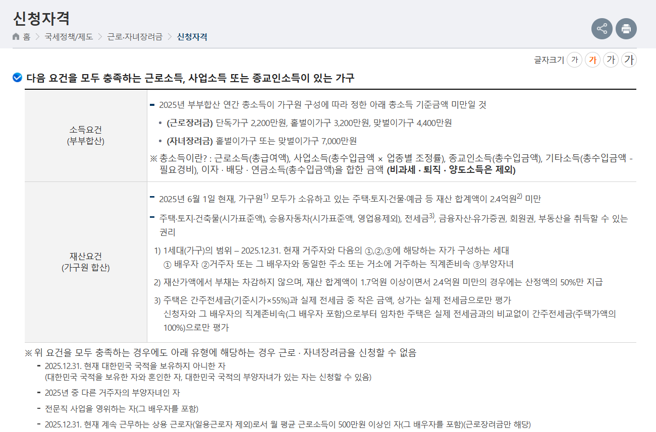 - 부양자녀 요건: 2025년 12월 31일 기준 18세 미만 자녀(2007.1.2. 이후 출생)가 있어야 자녀장려금 신청자격이 주어집니다.