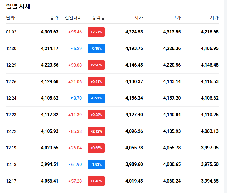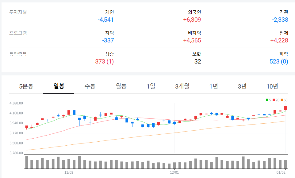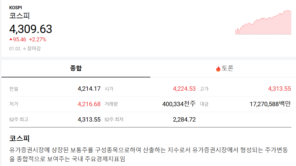 2026년 1월 2일 코스피는 장 초반부터 강한 상승세를 보이며 장중 한때 4,309.63p를 기록, 종가 기준 4,300선을 넘긴 첫날이 되었습니다.