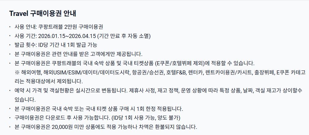 🔹 쿠팡트래블 20,000원은 눈썰매장·동물원·티켓 상품 등도 쓸 수 있어 가성비가 좋아요.