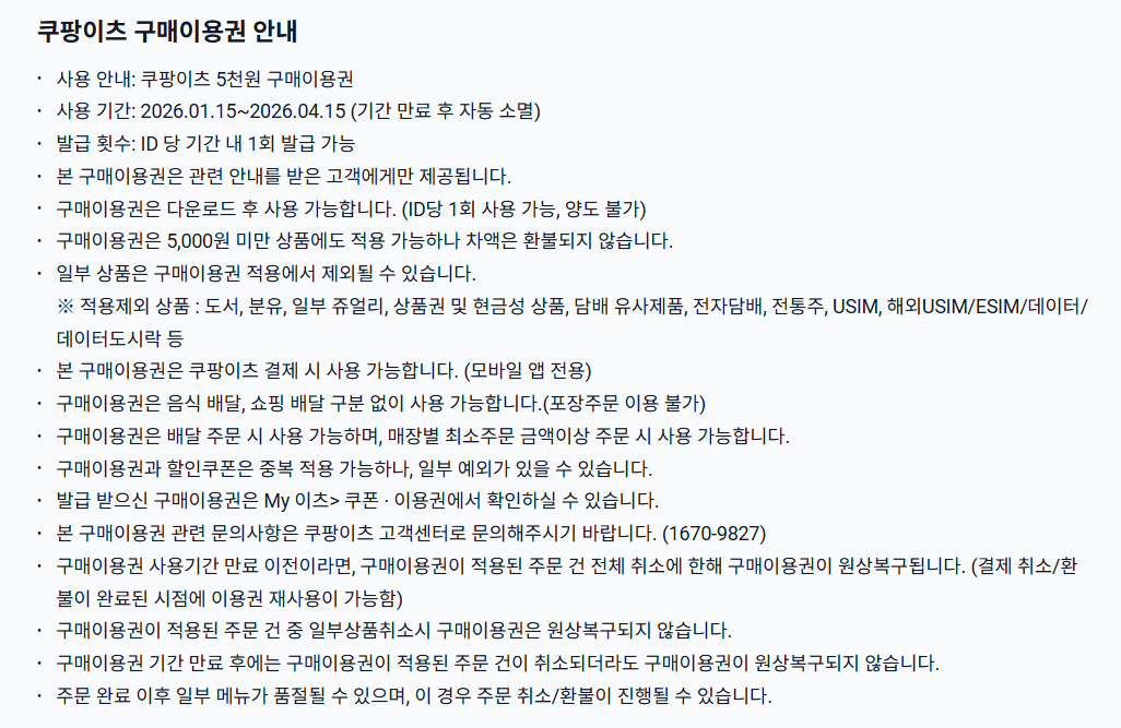 | 쿠팡이츠 이용권 | 5,000원 | 배달 주문 |