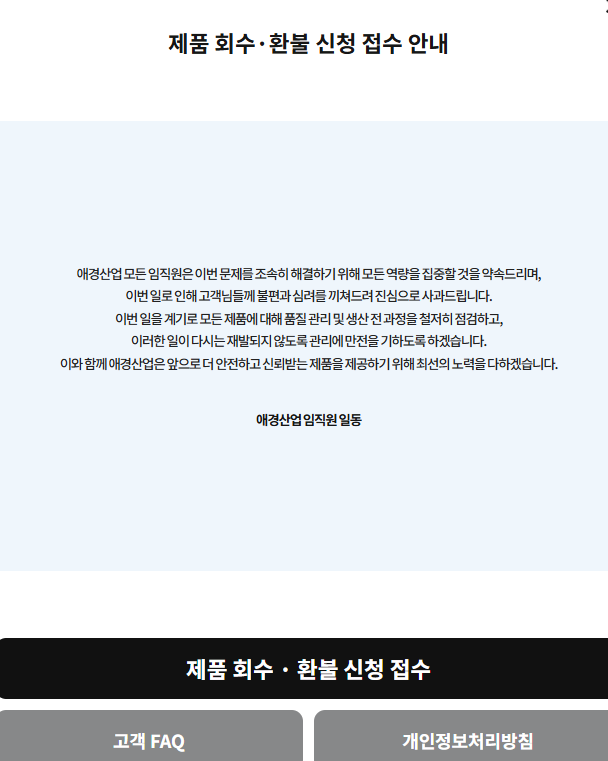 📦 회수 제품 상자에 “애경산업 반품용” 표시 후, 문 앞에 놓아두기