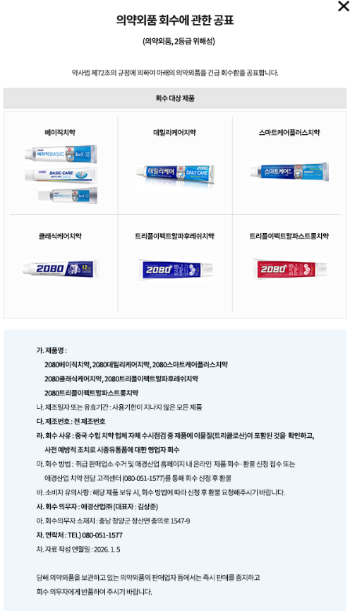 2026년 1월 5일부터, 일부 중국산 2080치약 제품에서 기준치를 초과한 트리클로산 성분이 발견되어