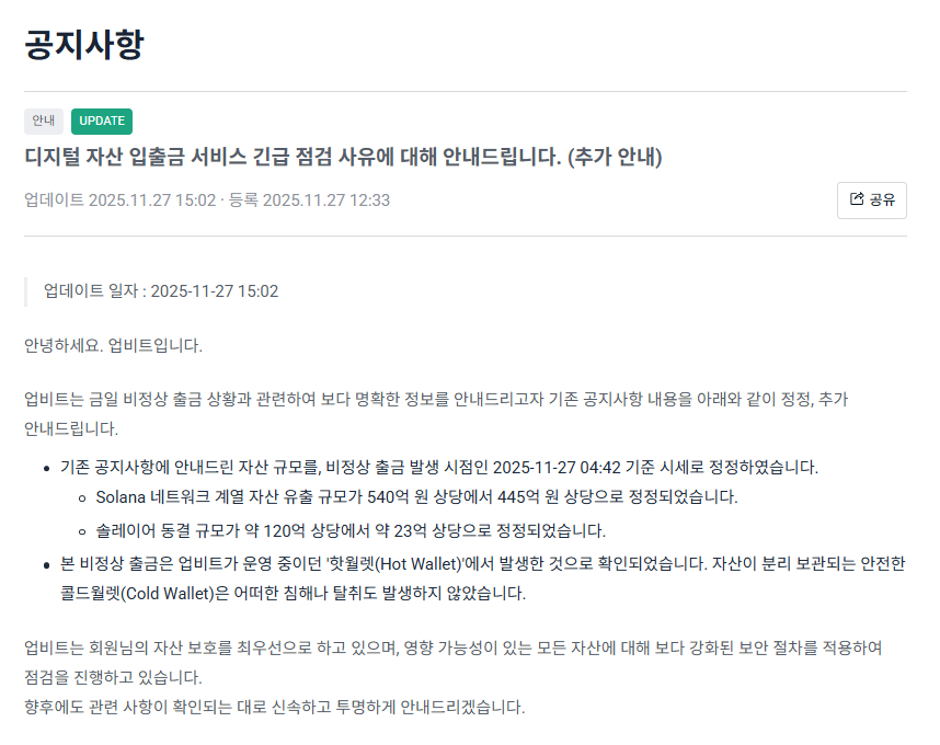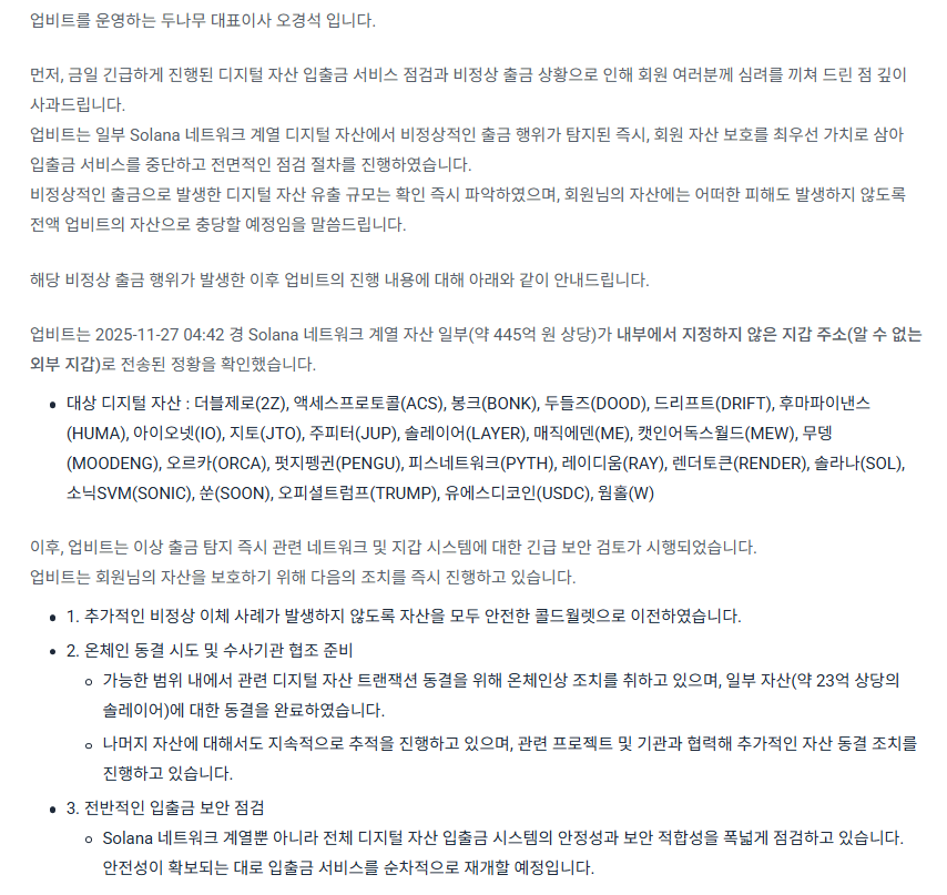 업비트는 공식 공지를 통해, “회원 피해는 없도록 업비트 자산으로 전액 보전하겠다”고 발표했지만, 현재 솔라나 계열 입출금이 전면 중단된 상태입니다.